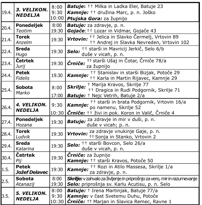 - V četrtek, 30. aprila, bo v Kamnjah po sv. maši srečanje svetopisemske skupine.